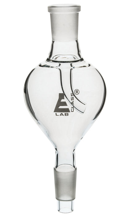 Splash Head made from high quality, heavy duty, 3.3 borosilicate glass. Vertical pear shape. Cone size 14/23. Socket size 14/23. Total length of 7". Eisco Labs Borosilicate glass has the following heat tolerances: Strain Point -515°C | Annealing Point 565°C | Softening Point 820°C.