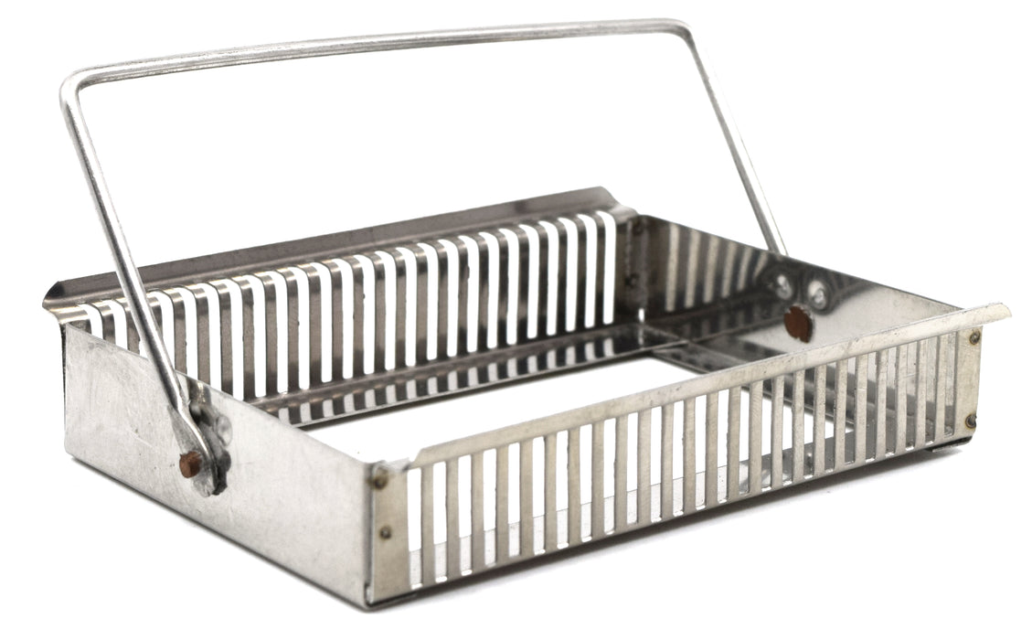 Staining rack made of Aluminum, with handles. Rack fits up to 25 slides, and features an open bottom for draining.