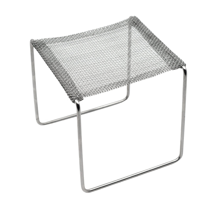 Made of chrome-plated steel wire with a heavy wire gauge top that evenly disperses heat. Designed to accommodate most alcohol burners. Size: 5"L x 5"W x 5"H.
