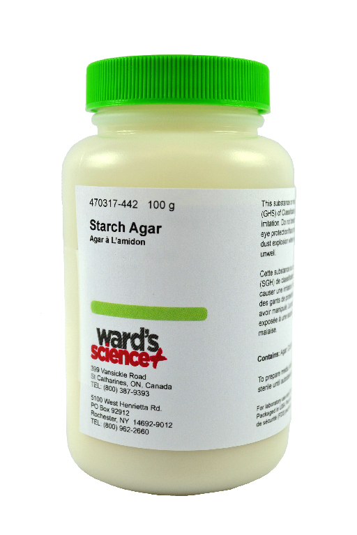 Used to determine if bacteria produce extracellular enzymes to catalyze the hydrolysis of starch. Organisms that produce a starch hydrolyzing enzyme will display a clear zone around the area of growth while other areas of the agar containing starch will turn blue-black., To prepare media, add 25 g of starch agar to a liter of distilled or de-ionized water. Follow instructions. The media will not be sterile until autoclaved prior to use., 02_BulletPoint: Starch agar is inoculated and incubated at 37 °C | After 48 hours the surface of the agar is flooded with potassium/potassium iodide solution, Size: 500 g, Cat. No.: 470317-444, Used to determine if bacteria produce extracellular enzymes to catalyze the hydrolysis of starch. Organisms that produce a starch hydrolyzing enzyme will display a clear zone around the area of growth while other areas of the agar containing starch will turn blue-black., To prepare media, add 25 g of starch agar to a liter of distilled or de-ionized water. Follow instructions. The media will not be sterile until autoclaved prior to use., 02_BulletPoint: Starch agar is inoculated and incubated at 37 °C | After 48 hours the surface of the agar is flooded with potassium/potassium iodide solution, Used to determine if bacteria produce extracellular enzymes to catalyze the hydrolysis of starch. Organisms that produce a starch hydrolyzing enzyme will display a clear zone around the area of growth while other areas of the agar containing starch will turn blue-black., To prepare media, add 25 g of starch agar to a liter of distilled or de-ionized water. Follow instructions. The media will not be sterile until autoclaved prior to use., 02_BulletPoint: Starch agar is inoculated and incubated at 37 °C | After 48 hours the surface of the agar is flooded with potassium/potassium iodide solution, Size: 100 g, Cat. No.: 470317-442