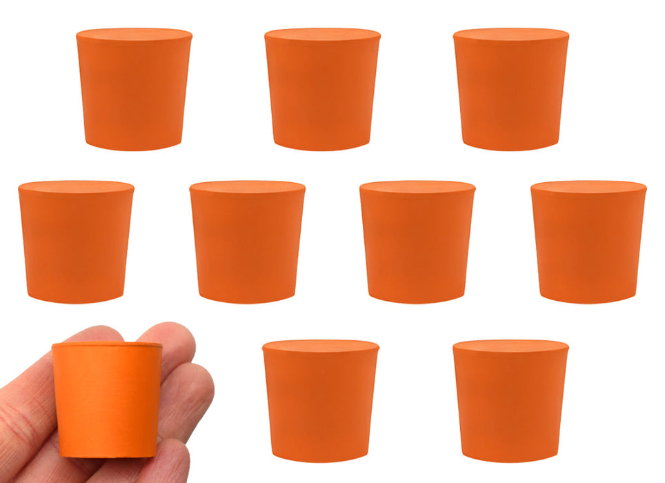 Pack of 10 superior-quality stoppers made from solid rubber in orange color. Each stopper measures 28mm in length, with a base diameter of 25mm and a top diameter of 28mm. The durable rubber construction is suitable for use with chemicals, resisting acids, alkalis, and ammonia. Easy to clean, the stoppers remain stable at temperatures between -20°C and 70°C. Designed for professional laboratory use, they are also perfect for various applications in the home and garage.