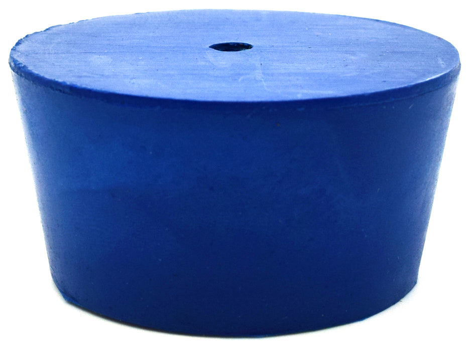 Pack of ten #10 stoppers made of long-lasting neoprene rubber in blue color. Each stopper features one hole measuring 5 mm in diameter. Manufactured according to sizes recommended by ASTM standards, each stopper measures 25 mm in length, with a base diameter of 42 mm and a top diameter of 50 mm. The neoprene rubber construction is suitable for use with petroleum products, minerals, oils, and fats, as well as most inorganic acids and bases, and is resistant to temperatures ranging from -40°C to 130°C.