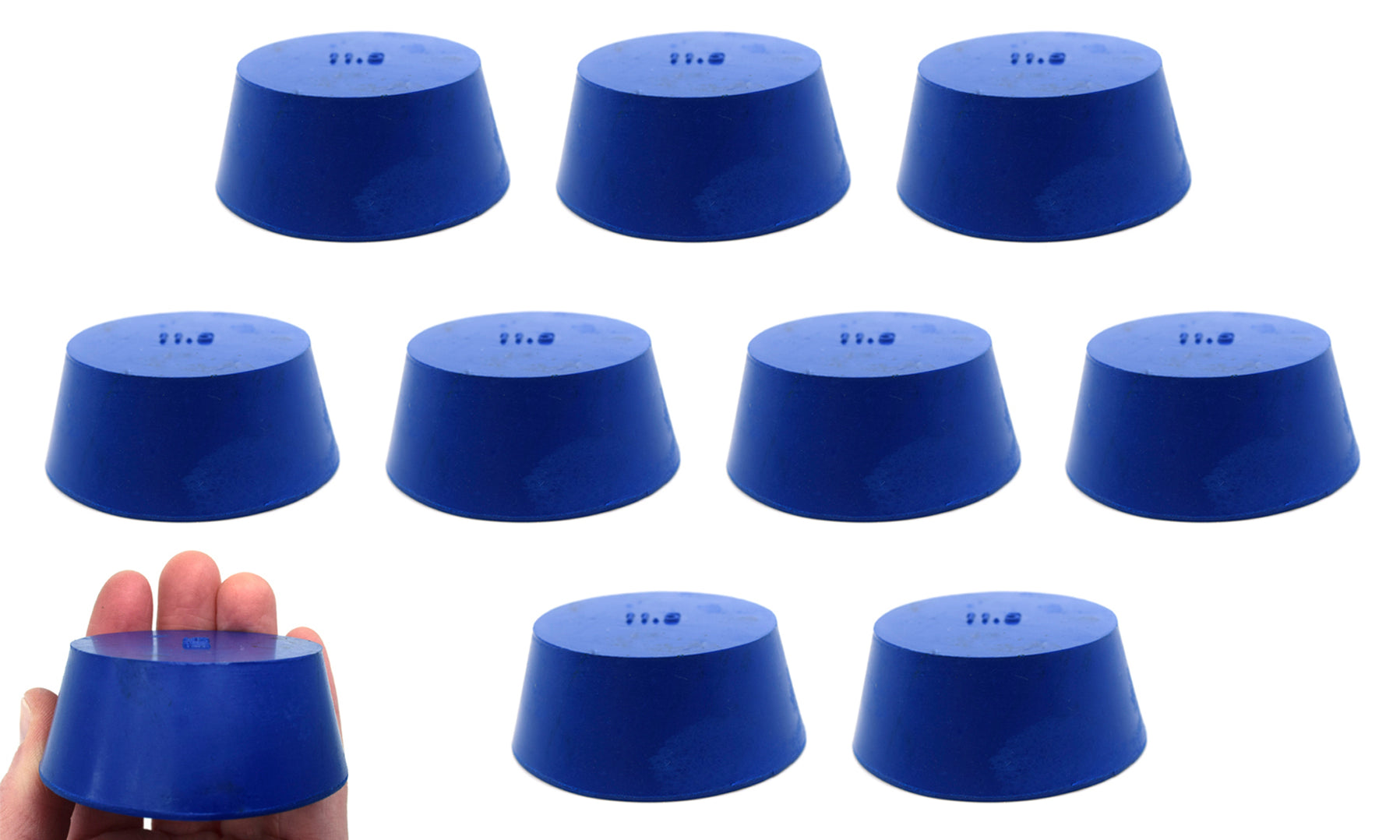 Here is the corrected text: This pack of ten #11.5 stoppers is made of solid, long-lasting neoprene rubber in blue color. Manufactured according to sizes recommended by ASTM standards, each stopper measures 25mm in length, with a base diameter of 50mm and a top diameter of 63mm. The neoprene rubber construction makes them suitable for use with petroleum products, minerals, oils, and fats, as well as most inorganic acids and bases. They are resistant to temperatures ranging from -40°C to 130°C.