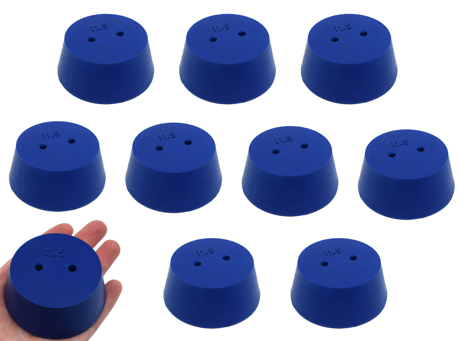 This pack of ten #11.5 stoppers is made of long-lasting neoprene rubber and features a blue color. Each stopper has two holes measuring 5 mm in diameter. Manufactured according to sizes recommended by ASTM standards, each stopper measures 25 mm in length, with a base diameter of 50 mm and a top diameter of 63 mm. The neoprene rubber construction is suitable for use with petroleum products, minerals, oils, and fats, as well as most inorganic acids and bases. It is resistant to temperatures ranging from -40°C to 130°C.