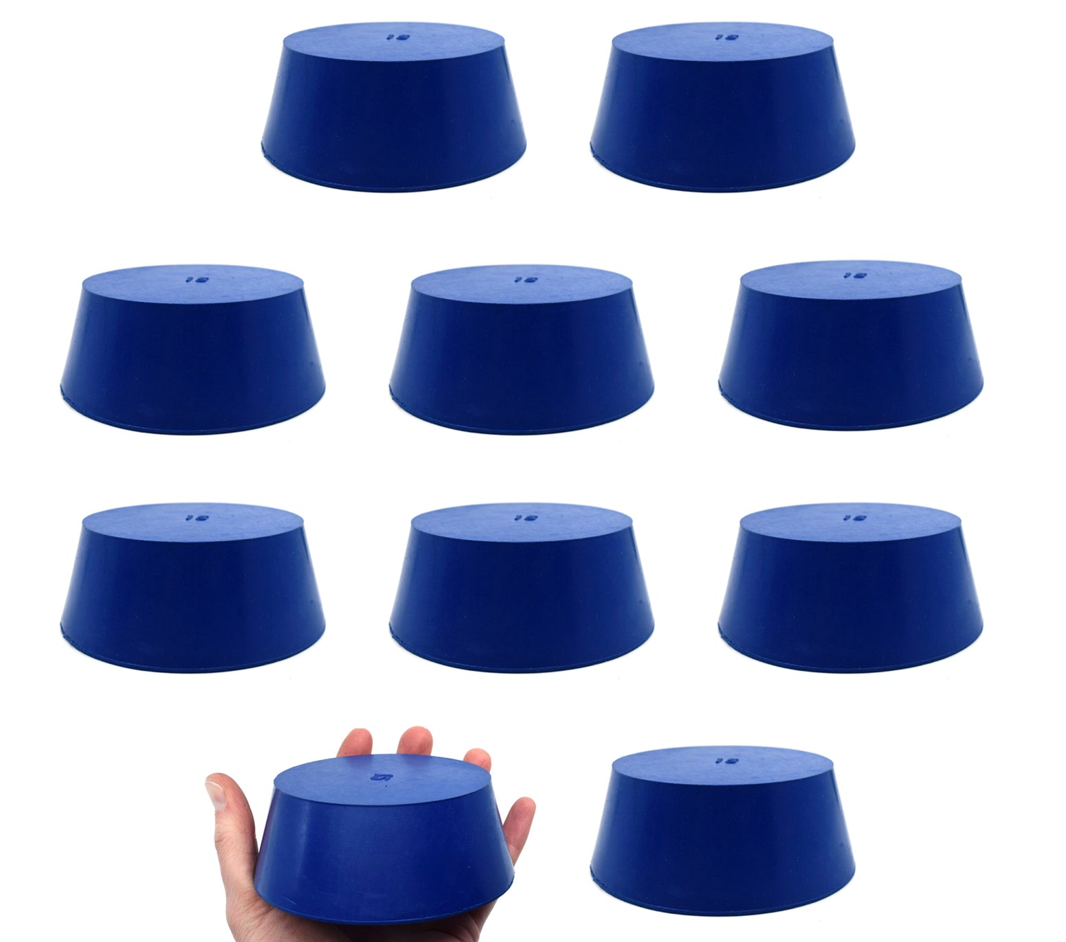 This pack of ten #15 stoppers is made of solid, long-lasting neoprene rubber in a blue color. Manufactured according to sizes recommended by ASTM standards, each stopper measures 39mm in length, with a base diameter of 83mm and a top diameter of 103mm. The neoprene rubber construction makes them suitable for use with petroleum products, minerals, oils, and fats, as well as most inorganic acids and bases. They are resistant to temperatures ranging from -40°C to 130°C.