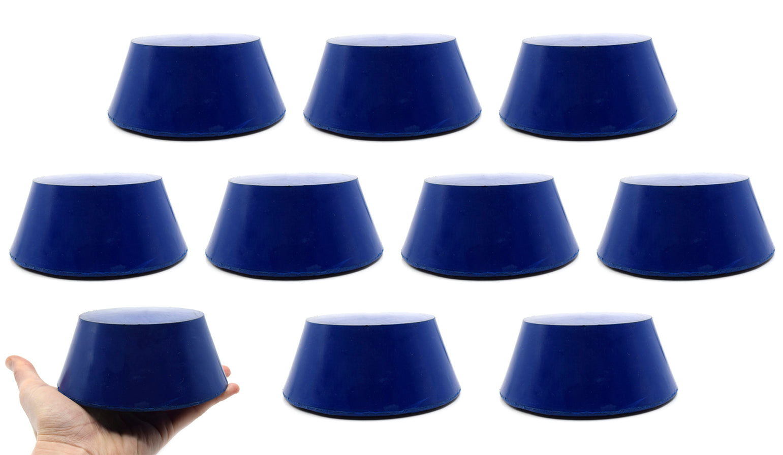 This pack of ten #16 stoppers is made of solid, long-lasting neoprene rubber and features a blue color. Manufactured according to the sizes recommended by ASTM standards, each stopper measures 50mm in length, with a base diameter of 90mm and a top diameter of 127mm. The neoprene rubber construction makes it suitable for use with petroleum products, minerals, oils, and fats, as well as most inorganic acids and bases. Additionally, it is resistant to temperatures ranging from -40°C to 130°C.