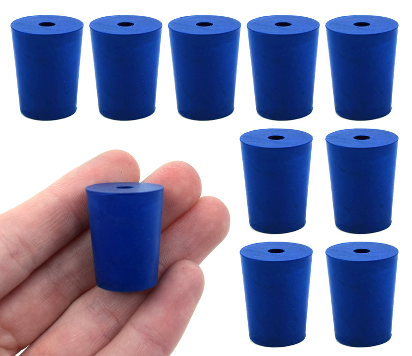 This pack of ten #2 stoppers is made from long-lasting neoprene rubber and features a blue color. Each stopper has one hole measuring 5mm in diameter. Manufactured according to sizes recommended by ASTM standards, each stopper measures 25mm in length, with a base diameter of 16mm and a top diameter of 20mm. The neoprene rubber construction makes it suitable for use with petroleum products, minerals, oils, and fats, as well as most inorganic acids and bases. Additionally, the stoppers are resistant to temperatures ranging from -40°C to 130°C.