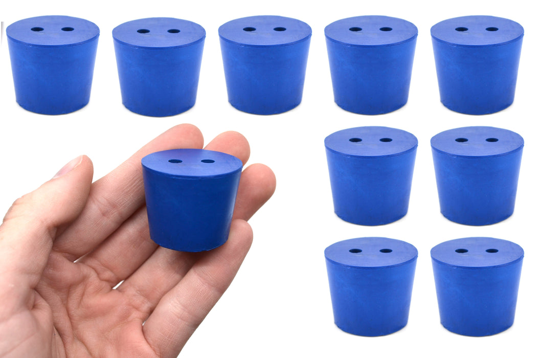Pack of ten #6 stoppers made of long-lasting neoprene rubber in blue color. Each stopper features two holes, measuring 5mm in diameter. Manufactured according to sizes recommended by ASTM standards, each stopper measures 25mm in length, with a base diameter of 26mm and a top diameter of 32mm. The neoprene rubber construction is suitable for use with petroleum products, minerals, oils, and fats, as well as most inorganic acids and bases. Resistant to temperatures ranging from -40°C to 130°C.