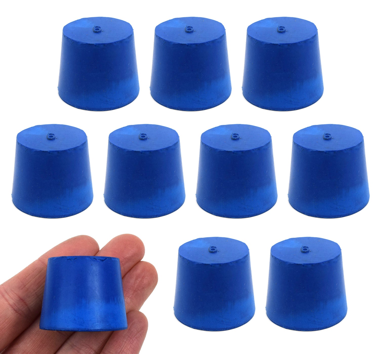 Pack of ten #6 stoppers made from solid, long-lasting neoprene rubber in blue color. Manufactured according to sizes recommended by ASTM standards, each stopper measures 25mm in length, with a base diameter of 26mm and a top diameter of 32mm. The neoprene rubber construction is suitable for use with petroleum products, minerals, oils, and fats, as well as most inorganic acids and bases, and is resistant to temperatures ranging from -40°C to 130°C.