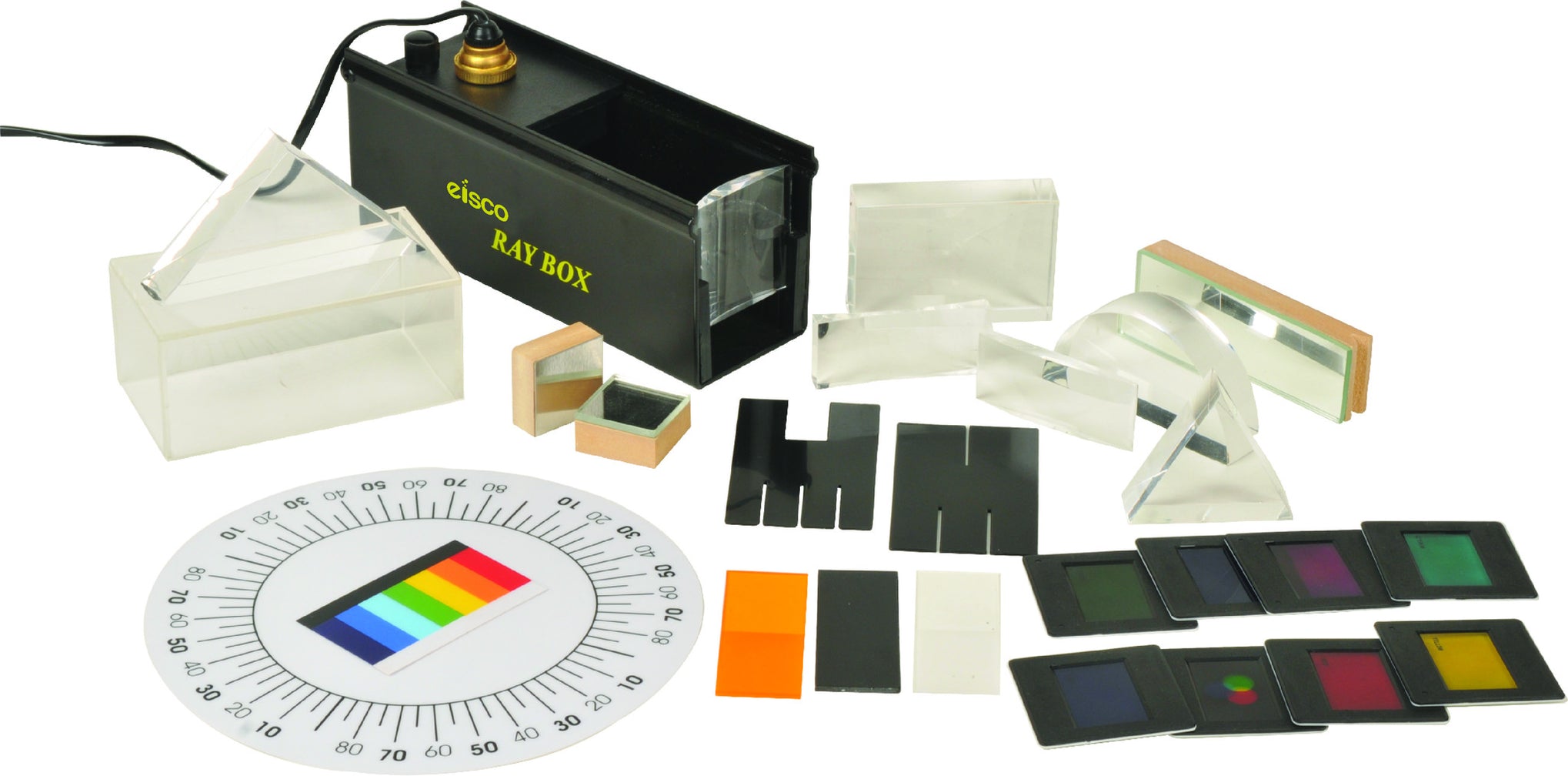 Set includes (1) Ray box, (3) Ray slit cards to make light rays, (1) Open vessel to add fluids of different refractive indices, (1) 360 degree optical bench disk, (2) Acrylic triangular blocks, (1) Acrylic Semi Circle Block, (1) Rectangular Block, (1) Extra Bulb for ray box, (8) Various color filters, (3) Mirrors, (1) Convex lens, (1) Double convex lens, (1) Double Concave lens, (1) Color index card, (2) Half Frosted slides