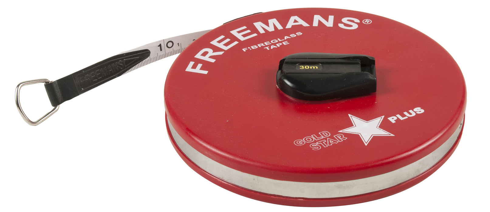 Fiberglass with PVC covering. Both sides metric, or one side metric and other in feet-inches. Non-conducting, waterproof, washable, and water-resistant. Case made of zinc-coated steel sheet, covered with vinyl and fitted with a flush winding-handle. Length 30 mtr