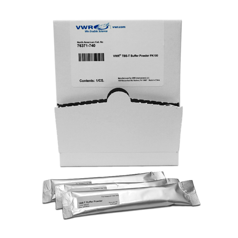 VWR® Buffer Powder Packs can save time and money, as there is no need to measure and weight many separate chemical components which is required when making buffers from scratch., VWR® Pre-measured buffer packs are extremely easy to use and are formulated so each pack makes 1 Liter of 1X buffer. Simply tear open a pack and mix completely with 1 liter of distilled water., 04_BodyText: Shipping costs are also minimal, as each case of 50 or 100 packs is compact and weighs only 2.5 Lbs., 02_BulletPoint: Buffer powder quickly dissolves to make 1L of 1X solution | No weighing or measuring of separate components | No pH adjustments required | Economical shipping, long shelf life | Quality and consistency guaranteed, 08_Certifications: COA avaialble for each lot number, 12_Packaging: Each case of buffer packs is packaged in a convenient dispenser box, which takes up very little lab space. Included in each case is an instruction insert, and a roll of stickers to label each container of prepared buffer solution., Final SAP Desc Link: 17076431, SAP Description Status: Ready, VWR® Buffer Powder Packs can save time and money, as there is no need to measure and weight many separate chemical components which is required when making buffers from scratch., VWR® Pre-measured buffer packs are extremely easy to use and are formulated so each pack makes 1 Liter of 1X buffer. Simply tear open a pack and mix completely with 1 liter of distilled water., 04_BodyText: Shipping costs are also minimal, as each case of 50 or 100 packs is compact and weighs only 2.5 Lbs., 02_BulletPoint: Buffer powder quickly dissolves to make 1L of 1X solution | No weighing or measuring of separate components | No pH adjustments required | Economical shipping, long shelf life | Quality and consistency guaranteed, 08_Certifications: COA avaialble for each lot number, 12_Packaging: Each case of buffer packs is packaged in a convenient dispenser box, which takes up very little lab space. Included in each case is an instruction insert, and a roll of stickers to label each container of prepared buffer solution., VWR® TBS-T Buffer Powder, Size: 100 pks, Cat. No.: 76371-740, pH: 7.25 - 7.55, Formulation: 137 mM NaCl, 2.7 mM KCl, 50 mM Tris, 0.1% Tween-20, Final SAP Desc Link: 17076431, SAP Description Status: Ready
