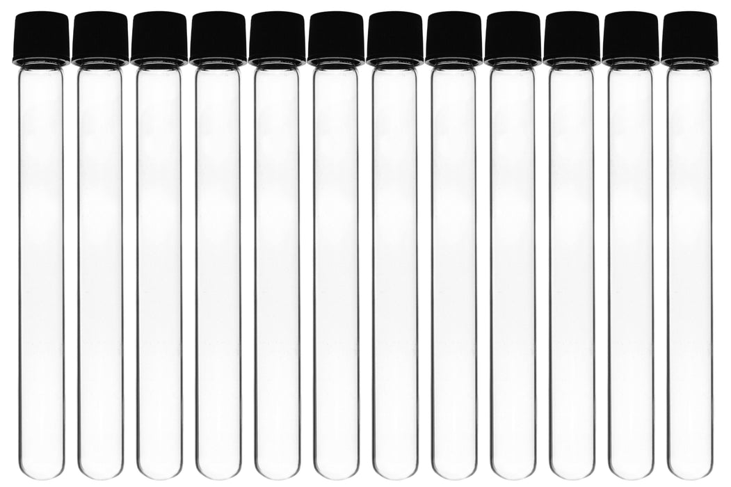 Here is the corrected text: Pack of twelve round-bottom culture tubes, each with a 20mL capacity. The tubes are made of high-quality Borosilicate 3.3 glass and include a Bakelite screw cap with a rubber liner for a leak-proof seal. These tubes are useful for various laboratory applications, including transferring and storing chemicals and samples, as well as handling and culturing biological material. They are also suitable for use in the home or garage for crafting and storage. The culture tubes are autoclavable and feature superior chemical durability with a low temperature gradient, allowing them to withstand high temperatures and thermal shocks. Each culture tube measures 0.6 inches wide and 5.9 inches tall (including cap). Designed for use in professional laboratories, they are an ideal choice for science classrooms and household use.