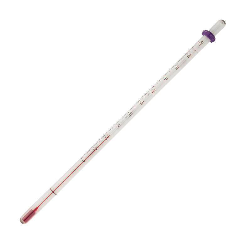 This thermometer features a red organic liquid against a white background glass and is designed for use in incubators and dry blocks, with a temperature range specifically tailored for these applications. It is suitable for all standard heating blocks and incubators. The thermometer boasts a PFA safety coating, which ensures that the liquid and glass remain encapsulated in case of breakage. Each unit is individually serialized. Key specifications include: Length: 225 mm; Catalog Number: 76491-644; Divisions: 1.0 °C; Accuracy: ±1.0 °C; Range: 0 to +100 °C; Immersion Depth: 35 mm.