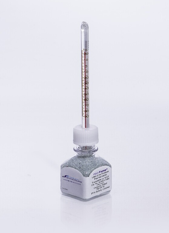 Here is the corrected text: These mercury-free thermometers are traceable to NIST and cover a range of -90 to 25°C. To achieve best results, insert the thermometer into the bottle and place it near the samples. Verify sample temperatures in freezers/ultra-low freezers with accurate temperature readings without sample contamination, achieved by using the filled bottle (included), which mimics the sample. The thermometers contain organic liquid or EnviroKleen certified Enviro-Safe liquid; they feature permanently fused markings and lead-free glass. A PFA coating safely contains the glass and liquid in case of breakage. Manufactured and tested by our USA quality team, each thermometer is individually serialized. They are supplied with a multi-language (English, French, German, Italian, Portuguese, and Spanish) statement of accuracy and traceability, plus VELCRO and magnetic attachments. **Product Specifications:** * Length: 145 mm (Cat. No.: 76491-670) or 135 mm (Cat. No.: 76491-674) * Environmentally Preferable: Safer Human and Environmental Health * Divisions: 1.0°C (Cat. No.: 76491-670) or 0.5°C (Cat. No.: 76491-674) * Accuracy: ±1°C, ±2°C from -1/-40°C, ±2.5°C below -40°C (Cat. No.: 76491-670); ±0.5°C (Cat. No.: 76491-674) * Application: For ultra-low freezers (Cat. No.: 76491-670) or for freezers (Cat. No.: 76491-674) * Range: -90 to +25°C (Cat. No.: 76491-670); -30 to +1°C (Cat. No.: 76491-674) * Certifications: Traceable to NIST * Coating: PFA coated