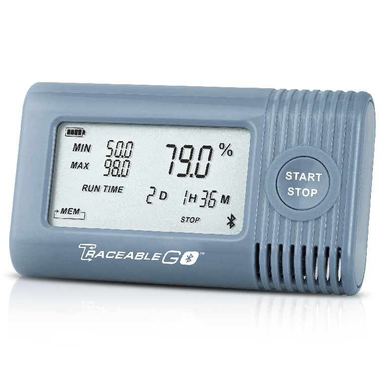 Here is the corrected text: Resolution: T: 0.1°C | RH: 0.1%. This Bluetooth device is the ideal transit partner for monitoring materials between destinations, safely transporting reagents, clinical samples, vaccines, pharmaceuticals, and food items to any location. With the TraceableGO mobile app, view if an alarm was triggered and generate an instant data report. The device stores up to 90 alarm events, recording readings once every 5 minutes by default, or the user may adjust the reading interval between one minute to once every 12 hours. Logging duration is 227 days (7.5 months). TraceableGO Bluetooth devices are pre-programmed with alarm values. The Bluetooth connection works with any Bluetooth-enabled device. Once the device arrives, enable the Bluetooth transfer to a smartphone by opening the TraceableGO app (available on iTunes or Google Play) and pairing the device to a smartphone. Download the recorded data once the device is enabled to send a report directly from a mobile device. This Bluetooth hygrometer datalogger fills in the unknowns between destinations, displaying critical information such as humidity and temperature, trip duration, MIN/MAX, battery level, and alarms on its LCD at all times. Data can be downloaded and devices reconfigured using the free TraceableGO app. An optional service allows unlimited stored data from an unlimited number of TraceableGO devices on a TraceableLIVE account for $30/month. To use: Press START to begin trip monitoring. Place the device inside a small cooler or even an entire pallet of material. Once the trip has ended, double-press START/STOP to enable Bluetooth and export data using the TraceableGO mobile app. The TraceableGO mobile app immediately identifies if the contents experienced conditions outside user-defined parameters. The device is compatible with TraceableGO or TraceableLIVE mobile apps and features simple, single-button use. Dimensions: 3.5×2×0.79 inches. Weight: 165 g. Cat. No.: 76214-378. Accuracy: T: ±0.4°C (-10...70°C), otherwise ±0.5°C | RH: ±3% (25 - 75%), otherwise ±5%. Range: T: -20...70°C (-4...158°F) | RH: 0 - 95%. The device is CE marked, RoHS compliant, and traceable to NIST, which assures accuracy from an ISO/IEC 17025:2017 (1750.01) calibration laboratory accredited by A2LA. This indicates traceability of measurements to the SI units through NIST or other recognized national measurement institutes (NMI) that are signatories to the CIPM mutual recognition agreement.