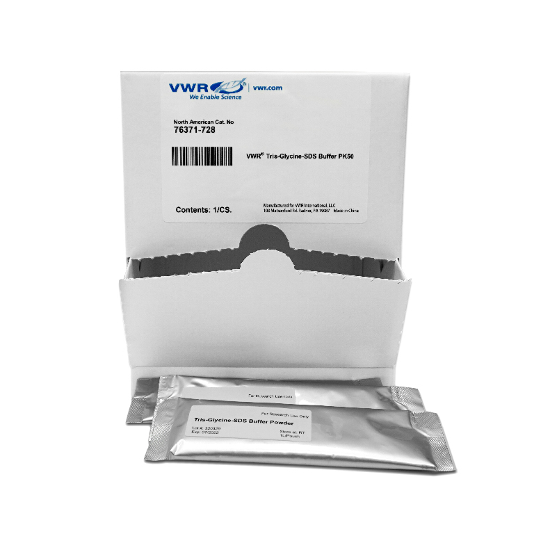 VWR® Buffer Powder Packs can save time and money, as there is no need to measure and weight many separate chemical components which is required when making buffers from scratch., VWR® Pre-measured buffer packs are extremely easy to use and are formulated so each pack makes 1 Liter of 1X buffer. Simply tear open a pack and mix completely with 1 liter of distilled water., 04_BodyText: Shipping costs are also minimal, as each case of 50 or 100 packs is compact and weighs only 2.5 Lbs., 02_BulletPoint: Buffer powder quickly dissolves to make 1L of 1X solution | No weighing or measuring of separate components | No pH adjustments required | Economical shipping, long shelf life | Quality and consistency guaranteed, 08_Certifications: COA avaialble for each lot number, 12_Packaging: Each case of buffer packs is packaged in a convenient dispenser box, which takes up very little lab space. Included in each case is an instruction insert, and a roll of stickers to label each container of prepared buffer solution., VWR® Tris-Glycine-SDS Buffer, Size: 50 pks, Cat. No.: 76371-728, pH: 8.1 - 8.6, Formulation: 25mM Tris, 192mM Glycine, 0.1% SDS, Final SAP Desc Link: 17076431, SAP Description Status: Ready, VWR® Buffer Powder Packs can save time and money, as there is no need to measure and weight many separate chemical components which is required when making buffers from scratch., VWR® Pre-measured buffer packs are extremely easy to use and are formulated so each pack makes 1 Liter of 1X buffer. Simply tear open a pack and mix completely with 1 liter of distilled water., 04_BodyText: Shipping costs are also minimal, as each case of 50 or 100 packs is compact and weighs only 2.5 Lbs., 02_BulletPoint: Buffer powder quickly dissolves to make 1L of 1X solution | No weighing or measuring of separate components | No pH adjustments required | Economical shipping, long shelf life | Quality and consistency guaranteed, 08_Certifications: COA avaialble for each lot number, 12_Packaging: Each case of buffer packs is packaged in a convenient dispenser box, which takes up very little lab space. Included in each case is an instruction insert, and a roll of stickers to label each container of prepared buffer solution., Final SAP Desc Link: 17076431, SAP Description Status: Ready