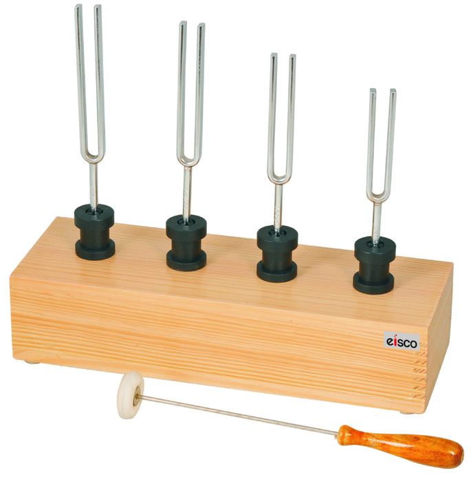 This product consists of four steel forks mounted on a common box, each tuned to a specific frequency: C (256), E (320), G (384), and C (512). It comes complete with a hammer, ideal for demonstrating the formation of basic major chords.