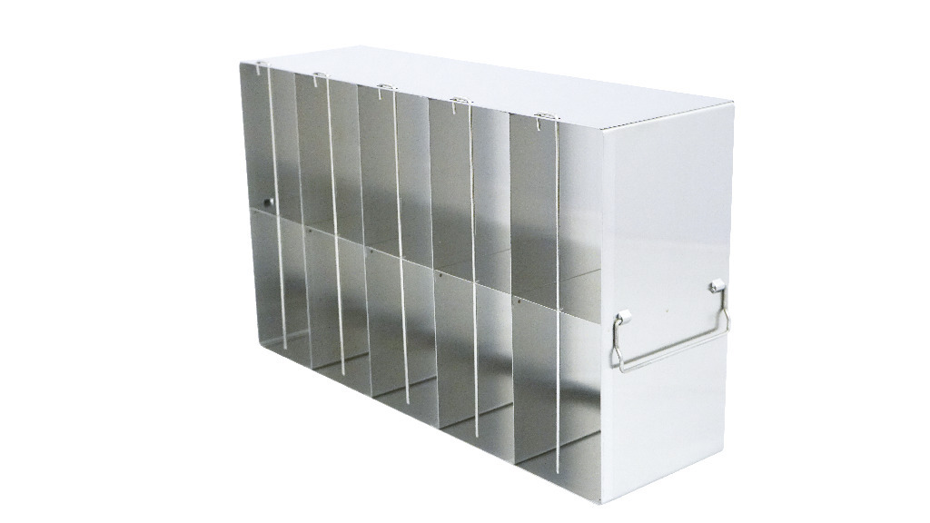 Upright Freezer Rack 466 x 280 x 140 mm^ Upright Freezer Rack, with Locking Rod, Material: Stainless Steel, Box capacity: 85 plates with lids or 95 plateswithout lids configuration, For 96/384-well microtiter plates, Outside Dimension: 466 x 280 x 140 mm