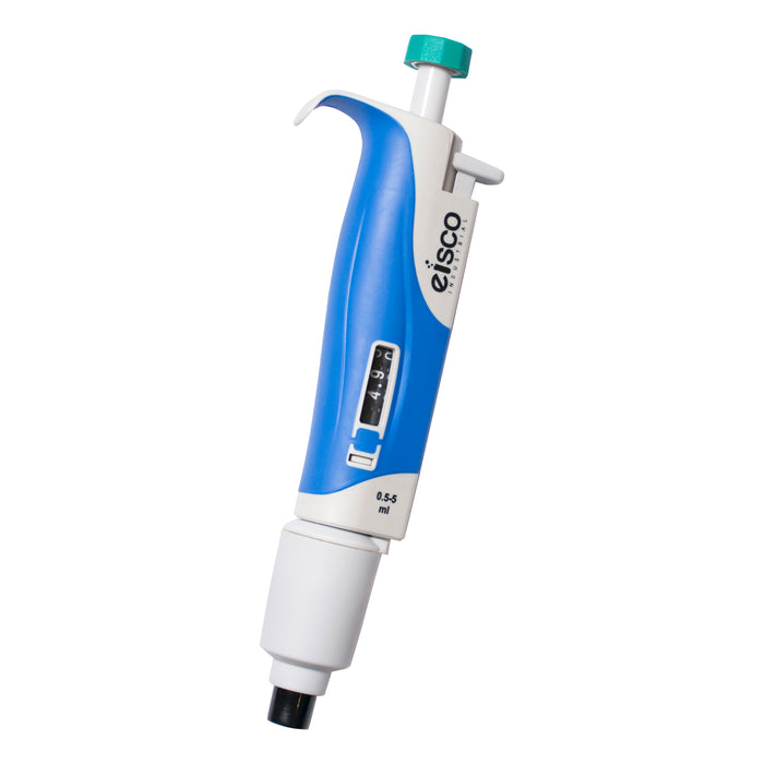 High-Performance Micropipette • Variable volume micropipette with a 500-5000 μL volume range in 50 μL increments • Comfortable • Features soft and lightweight operation with an ergonomic, soft-touch tip ejector designed to minimize hand fatigue, reduce thumb stress, and increase comfort during prolonged use • Accurate • Fully autoclavable with a durable, autoclavable PVDF tip cone and a slip-resistant thermoplastic elastomer (TPE) body grip to minimize the transfer of body heat to the micropipette, resulting in high accuracy even with continuous use • Color-Coded • The entire series of micropipettes (Eisco part numbers: VVM1-13) features color-coded plungers for easy identification • Calibrated • Calibration conforms to DIN 12650 and EN-ISO 8655 standards, ensuring high accuracy and precision; a calibration report is enclosed with every micropipette.