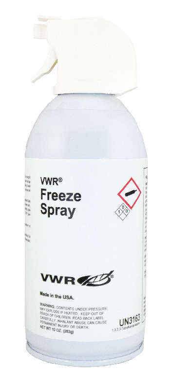 Instantly cool electrical components to –65 °F., VWR® Freeze spray is a nonflammable aerosol that delivers freezing power exactly where needed. It cools to –65 °F (18.3 °C), dries fast, and leaves no residue. This freeze spray is ideal for lowering the temperature on electrical components to test intermittent faults, detect defective transistors, and provide protection during soldering. Saves time and eliminates water crystals caused by slower freezing methods., 02_BulletPoint: Dries fast and leaves no residue | Quickly deliver freezing power to hard-to-reach places | Ultra-low global warming potential (GWP) | Nonflammable and ozone safe, 13_Caution: Contact with skin can cause irritation or frostbite., Final SAP Desc Link: 36021815, SAP Description Status: Ready, Instantly cool electrical components to –65 °F., VWR® Freeze spray is a nonflammable aerosol that delivers freezing power exactly where needed. It cools to –65 °F (18.3 °C), dries fast, and leaves no residue. This freeze spray is ideal for lowering the temperature on electrical components to test intermittent faults, detect defective transistors, and provide protection during soldering. Saves time and eliminates water crystals caused by slower freezing methods., 02_BulletPoint: Dries fast and leaves no residue | Quickly deliver freezing power to hard-to-reach places | Ultra-low global warming potential (GWP) | Nonflammable and ozone safe, 13_Caution: Contact with skin can cause irritation or frostbite., VWR® Freeze spray, Size: 284 g (10 oz.), Cat. No.: 76528-072, Final SAP Desc Link: 36021815, SAP Description Status: Ready