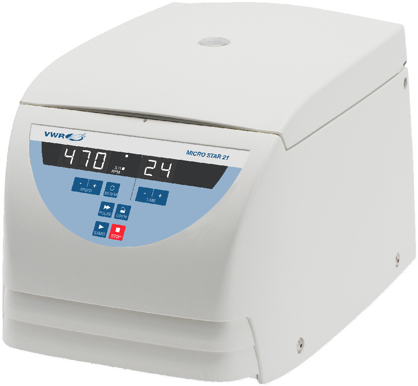 VWR® Micro Star 21 ventilated and 21R refrigerated microcentrifuge with 24×1.5/2.0 ml rotor with ClickSeal™ biocontainment lid offer exceptional acceleration of up to 21000 xg in as little as 12 seconds., Refrigerated version offers cooling from room temperature to set temperature in as little as 9 minutes., 04_BodyText: Centrifuges have a 2 year warranty. Rotors have a different warranty period., 02_BulletPoint: Durable and flexible rotors | Outstanding corrosion resistance with lightweight engineered polymer rotors | Standard rotor runs 24 microcentrifuge tubes in a single row, from 1.5 to 2.0 ml tubes to mini-preps and spin columns | ClickSeal™ Biocontainment solution gives ergonomic one-click rotor opening and closing, as well as transparent design for added safety and convenience with ClickSeal™ biocontainment lids | Quiet, easy to use design means simplify operation with intuitive controls, easy-to-read displays and fast one-click centrifuge lid closure | Sleek, lightweight, space-saving design is durable and easy to clean and maintain | Quiet performance promotes a safe, stress-free environment, 08_Certifications: ANSI/UL 61010-1 3.1 Edition | UL 61010-2-020 3rd Edition | UL 61010-2-011 2nd Edition | UL 61010-2-101 3rd Edition | FCC Part 15 | ICES-001 | EN ISO 14971 | ISO 9001, 11_Delivery: Units supplied with 24×1.5/2.0 ml rotor with ClickSeal biocontainment lid as standard., Max. Speed: 14800 rpm, VWR® Micro Star 21 ventilated and 21R refrigerated microcentrifuge with 24×1.5/2.0 ml rotor with ClickSeal™ biocontainment lid offer exceptional acceleration of up to 21000 xg in as little as 12 seconds., Refrigerated version offers cooling from room temperature to set temperature in as little as 9 minutes., 04_BodyText: Centrifuges have a 2 year warranty. Rotors have a different warranty period., 02_BulletPoint: Durable and flexible rotors | Outstanding corrosion resistance with lightweight engineered polymer rotors | Standard rotor runs 24 microcentrifuge tubes in a single row, from 1.5 to 2.0 ml tubes to mini-preps and spin columns | ClickSeal™ Biocontainment solution gives ergonomic one-click rotor opening and closing, as well as transparent design for added safety and convenience with ClickSeal™ biocontainment lids | Quiet, easy to use design means simplify operation with intuitive controls, easy-to-read displays and fast one-click centrifuge lid closure | Sleek, lightweight, space-saving design is durable and easy to clean and maintain | Quiet performance promotes a safe, stress-free environment, 08_Certifications: ANSI/UL 61010-1 3.1 Edition | UL 61010-2-020 3rd Edition | UL 61010-2-011 2nd Edition | UL 61010-2-101 3rd Edition | FCC Part 15 | ICES-001 | EN ISO 14971 | ISO 9001, 11_Delivery: Units supplied with 24×1.5/2.0 ml rotor with ClickSeal biocontainment lid as standard., Capacity: 24× 1.5/2 ml, VWR® Micro Star 21R refrigerated microcentrifuge with 24×1.5/2.0 ml rotor with ClickSeal™ biocontainment lid, Model: Micro Star 21R, Refrigerated: Refrigerated, Max. RCF: 21100×g, Cat. No.: 76533-878, W×D×H: 295×445×330 mm (11.6×17.5×12.9"), Electrical: 120 V, Weight: 28.0 kg (62.0 lbs.), Max. Speed: 14800 rpm, VWR® Micro Star 21 ventilated and 21R refrigerated microcentrifuge with 24×1.5/2.0 ml rotor with ClickSeal™ biocontainment lid offer exceptional acceleration of up to 21000 xg in as little as 12 seconds., Refrigerated version offers cooling from room temperature to set temperature in as little as 9 minutes., 04_BodyText: Centrifuges have a 2 year warranty. Rotors have a different warranty period., 02_BulletPoint: Durable and flexible rotors | Outstanding corrosion resistance with lightweight engineered polymer rotors | Standard rotor runs 24 microcentrifuge tubes in a single row, from 1.5 to 2.0 ml tubes to mini-preps and spin columns | ClickSeal™ Biocontainment solution gives ergonomic one-click rotor opening and closing, as well as transparent design for added safety and convenience with ClickSeal™ biocontainment lids | Quiet, easy to use design means simplify operation with intuitive controls, easy-to-read displays and fast one-click centrifuge lid closure | Sleek, lightweight, space-saving design is durable and easy to clean and maintain | Quiet performance promotes a safe, stress-free environment, 08_Certifications: ANSI/UL 61010-1 3.1 Edition | UL 61010-2-020 3rd Edition | UL 61010-2-011 2nd Edition | UL 61010-2-101 3rd Edition | FCC Part 15 | ICES-001 | EN ISO 14971 | ISO 9001, 11_Delivery: Units supplied with 24×1.5/2.0 ml rotor with ClickSeal biocontainment lid as standard., Capacity: 24× 1.5/2 ml, VWR® Micro Star 21 ventilated microcentrifuge with 24×1.5/2.0 ml rotor with ClickSeal™ biocontainment lid, Model: Micro Star 21, Refrigerated: -, Max. RCF: 21100×g, Cat. No.: 76533-876, W×D×H: 225×243×352 mm (8.9×9.6×13.8"), Electrical: 120 V, Weight: 10.5 kg (23.1 lbs.)