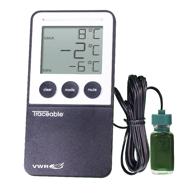 Reliably monitor and be alerted to any issues affecting the contents of your fridge or freezer without even opening the door! Easily monitor liquid temperature in baths and air/gas temperature in incubators, refrigerators, or freezers. Keep track of temperature conditions overnight or for any time period—the minimum and maximum temperatures are stored until the memory is cleared. Models feature a triple display that simultaneously shows current, minimum, and maximum temperatures. Set high and low alarms in 1° increments; the alarm sounds when the temperature rises above or falls below set points and continues to sound even if the temperature returns to a non-alarm range. Thermometer reads ambient temperature or external probe temperature. The probe is attached to a 3m (10') micro-cable that permits a door to close on it; the probe and cable are both submersible. Mount the meter with included hook-and-loop strips, wall-mount slots, or use the flip-open stand on a benchtop. Alarm indicator lights up brightly to draw your attention to an immediate issue. Know about excursions before they happen with the pre-alert alarm light that glows orange when your fridge or freezer is within 1 degree of your alarm setting. Use the mute button to silence the buzzer alarm while you are investigating the issue. Staff onboarding is a breeze with an enhanced, more intuitive user experience including large buttons, high-contrast text, and purposeful design. Reduce upkeep with boosted battery power and interior tech upgrades for higher performance. Maintain compliance; includes NIST-traceable certificate from our A2LA accredited (1750.01) calibration laboratory. Make readings quickly and with certainty using the triple display—shows current, high, and low temperatures simultaneously. Pick the probe option that fits your application. Includes thermometer, probe, hook-and-loop tape, AAA batteries, quick start guide, and Traceable certificate. VWR Traceable fridge/freezer digital thermometer with bottle probe, bullet probe, or 5 ml vaccine bottle probe. Resolution: 1 °C No. of Channels: 1 Accuracy: ±1 °C Probe: Bottle probe, Bullet probe, or 5 ml Vaccine bottle probe Range: –50...70 °C (–58...158 °F) W×D×H: 0.75D×4.25" H Display: 0.75" LCD triple-display Probe: 0.875L×0.1875" Ø Probe Cable Length: 3 m (9.8') Cat. No.: 76595-160, 76595-162, 76595-164