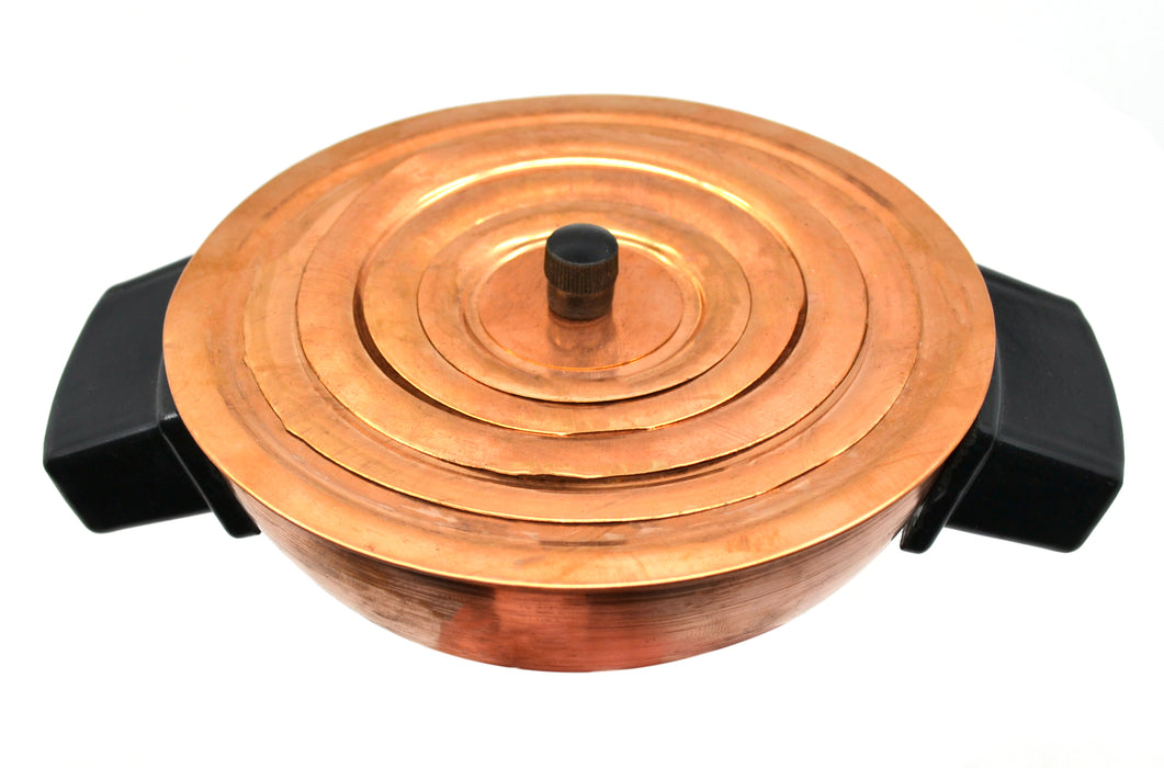 Hemispherical Water Bath made of copper sheet. 100ml capacity. The lid is comprised of a set of concentric rings. Approximately 4" diameter (100mm). Features two side handles and a top handle for safe and easy handling.